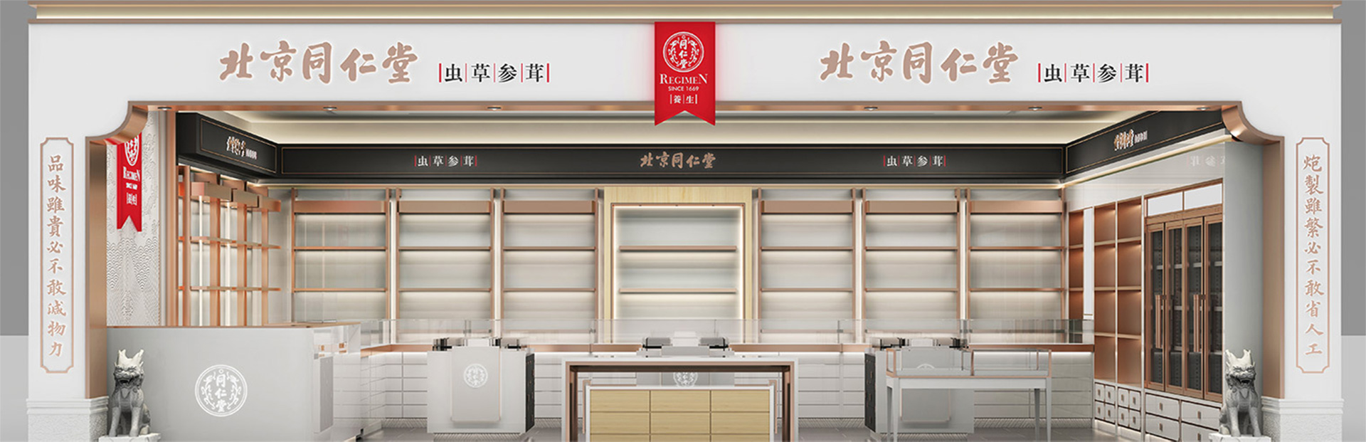我們在進行設計時取舍繁雜的元素,協調色彩、使標識簡潔易懂。遵循清朝皇家建筑匾額和皇帝冠冕的形式設計布局,同仁堂的堂徽位列正中,在旗幟標的襯托下更加醒目。兩側金字招牌清晰明了的說明了店鋪售賣的產品[參茸蟲草],能使人一目了然地了解店鋪的經營特色。立柱上書寫同仁堂人盡皆知的文化理念,體現同仁堂作為皇家御用的文化背書和傳承。