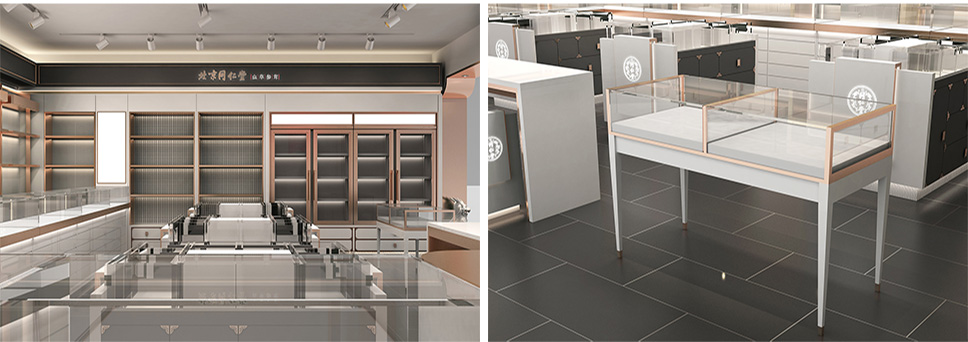 采用深灰、白和玫瑰金色搭配,使整體店面既有富麗堂皇之氣場,也有清新脫俗之雅韻。一方面與同仁堂傳統店面形象區分開來,另一方面在傳承同仁堂文化的同時也對同仁堂形象進行了升華,使其店面更具視覺特點和識別性;更加現代時尚,符合未來人群的審美情趣。