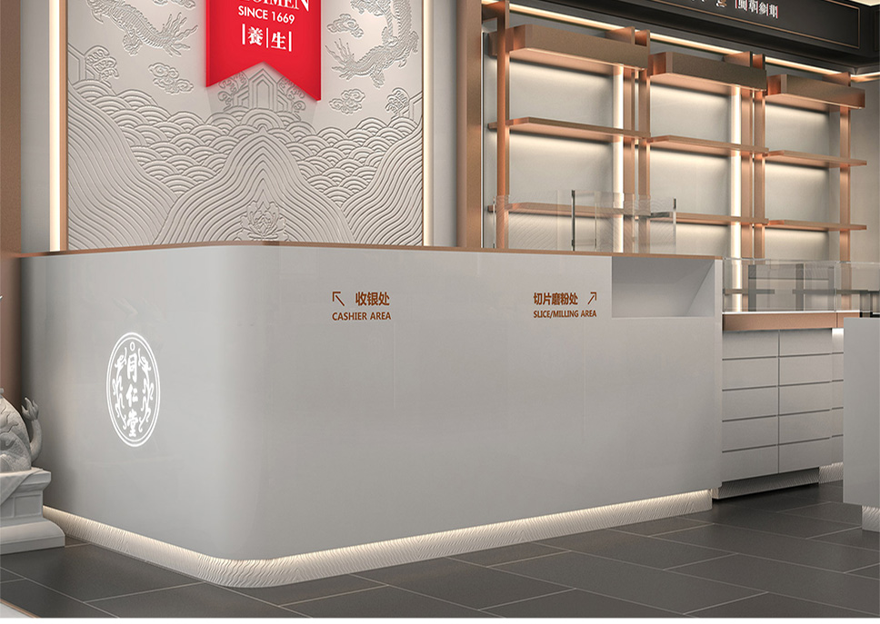 強化燈光、色彩、材質之間的效果互補,創新工藝組合,區隔了傳統藥店陳舊思維,新穎獨特,體現了同仁堂的品質。