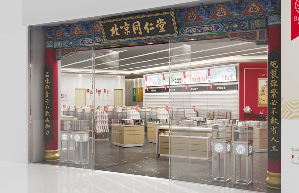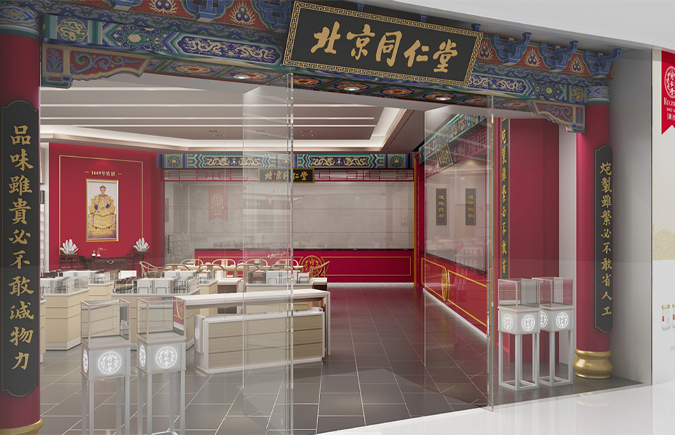 以中國傳統的對稱平衡為基本原則,以戶為門,以牖為窗,在保留了同仁堂經典元素的同時進行店面優化升級。