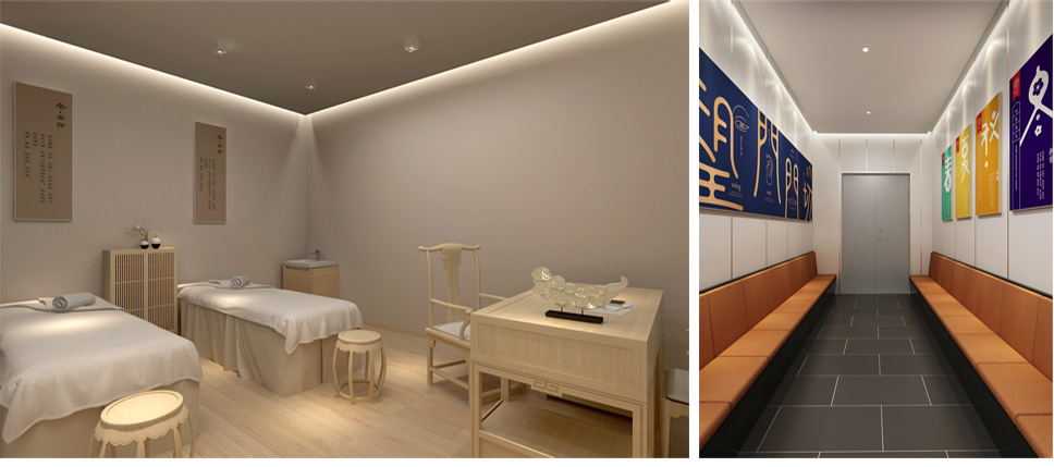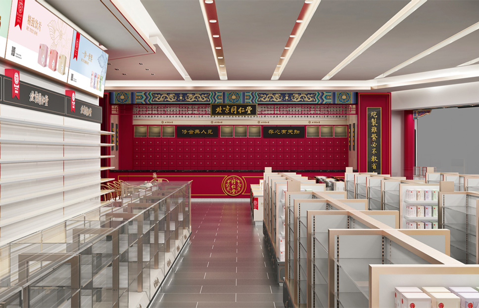 內部設計相比外部設計而言,涉及的設計元素更多,難度也更大。涉及的元素包括通道、柜臺、色彩、燈光、音樂、商品陳列布局等。我們依據同仁堂的文化屬性,強化空間布局及持續改善功能,讓顧客停下腳步,體驗、了解商品,實現產品動銷,門店增量。