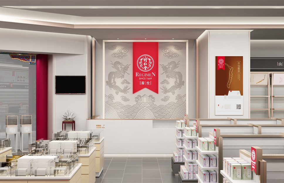 李華清圍繞“復興同仁堂文化,擁抱年輕人市場”的愿景,以突出的視覺語言表現為終端賦能,通過空間規劃、燈光系統、配色方案、軟裝配飾、文化展示、材料運用、產品產列等方面內容,塑造出強大的形象識別力,讓同仁堂一夜之間獲得年輕態,幫助同仁堂灶建立有文化底蘊的年輕品牌。