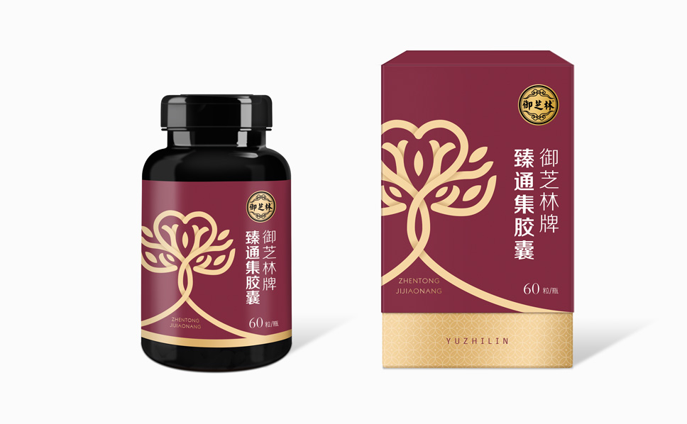 臻通集膠囊的定位人群為中老年人,具有輔助降血脂、增強免疫力的保健功能,李華清通過前期的分析,在視覺表現(xiàn)上運用樹、心形、頭腦、手等元素進行組合,形成臻通集膠囊戰(zhàn)略元素,達到視覺聚焦效果,抽象畫的圖形,用金色戰(zhàn)略色彩體現(xiàn),更具有品質感。